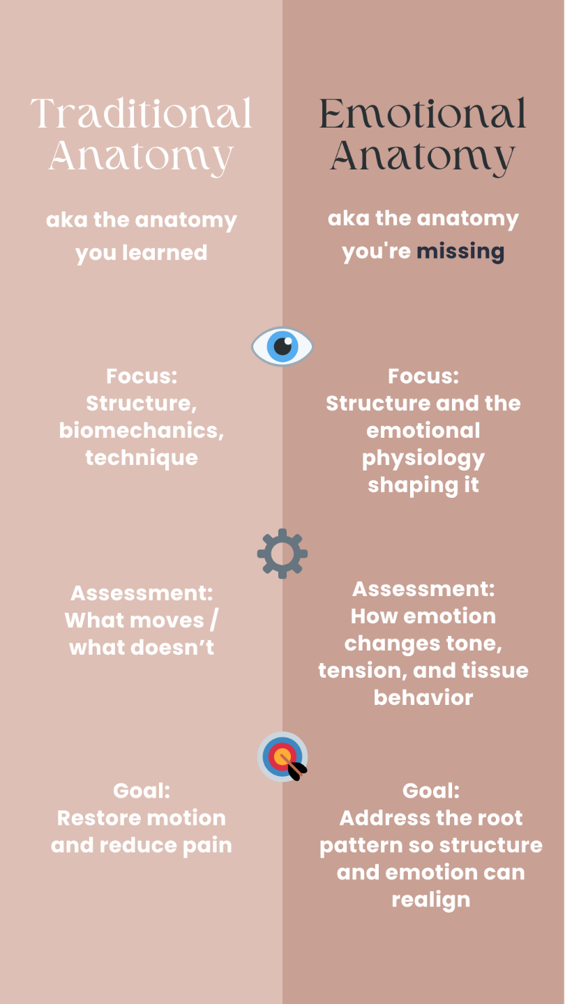 “When you start seeing through the lens of emotional anatomy, everything in your practice shifts — your hands, your language, your outcomes, and your joy.”